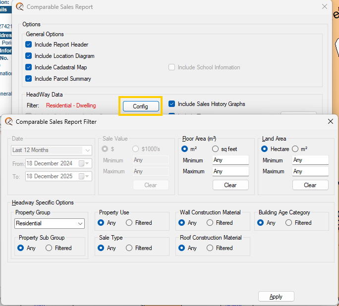 Config button allows you to modify the property type filters. - ● Sales History Graphs – Compare Sales / Rateable Value over the last 2 and 10 years in the area.
