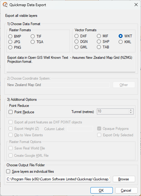 Most property and Topographic data in Quickmap may be exported from Quickmap in a wide range of raster and vector file formats, and freely distributed in other software packages. Data may be exported in over 60 different Coordinate Systems for export. The Export tool is activated by selecting File> Export off the menu.
