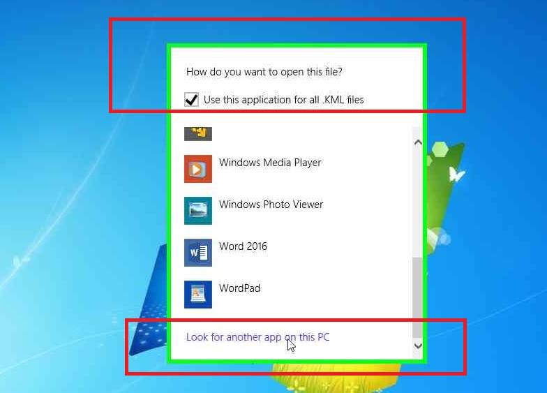 - Scroll down and select Google Earth then click OK – you are now done and don’t need to follow any more steps. However, if you don’t have Google Earth listed, scroll right to the bottom of the list and click “Look for another app on this PC”.