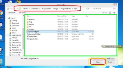 - Browse to and click on the Google Earth executable, then click Open. Most likely your Google Earth executable will be stored in C:\Program Files\Google\Google Earth Pro\client\googleearth.exe. If it isn’t, you can right click Google Earth on your Start menu or Desktop and click Open File location to find out where it is. Once you have found out where it is, you can navigate to that location in the previous window, select googleearth.exe and click Open.
