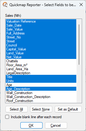 From the Quickmap Reporter, click to select fields to report on (blue) then OK. To deselect a field, click so that the field is no longer highlighted blue.